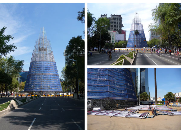 I’d hoped they’d have finished building it by the time I cycled past it this Sunday, but I guess the worlds biggest Christmas Tree isn’t something that can be rushed. Still, just in case you’re interest in the progress they have made since last week, here’s a few more snaps! It has to be said that there are quite a few  residents of Mexico City who feel that this isn’t the best way to spend  money during an economic crisis with acute ongoing water shortages, but I myself like Christmas and Christmas trees! And I also feel that the worlds largest ice rink, which will be going up in the Zocalo any day now is a much more questionable project regards funding – exactly how much does it cost to keep an ice rink frozen on sunny, 20 to 25 degree,  days in Mexico City?