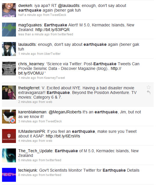 If I feel a quake I’ll usually pop over the the USGS website which records all global quakes and will quickly tell you how strong it actually was. Today I came across an interesting project they are running, to get Twitter data from people living in zones where a quake has just struck. Interesting for several reasons, to me anyway. Firstly, because we have so many quakes here. Secondly, because as I mentioned, I tweeted about an earthquake recently. I must have been one of the first people to tweet it, because I hit end as the quake was still doing its thang. To think, next time, my tweet could be contributing to the scientific community! But they’ll have a lot of dross to trawl through…a quick search of Twitter for ‘earthquake’ brings up quite a bit of rubbish!