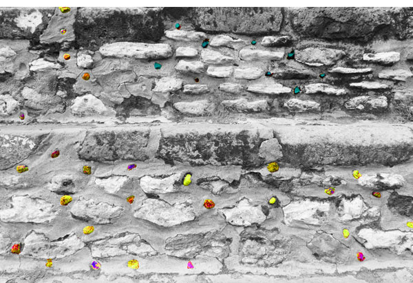 When I first started touring ancient Mexican ruins, I was amazed at how decorative they were. Even going so far as to putting little pebbles into the cement holding the big stones of pyramids and other grand structures together. I know…naive. But for those who thought like I did, until someone told me different, those stones are there for a reason. I’ve manipulated the image above to highlight the pebbles. They are places there when ruins are being restored as markers to show which parts have been restored. There is, however, another way of telling the difference between what’s been restored and what hasn’t….sharp edges – someone has been at it. A pile of rubble, or a big lump of mud and grass – someone hasn’t.
