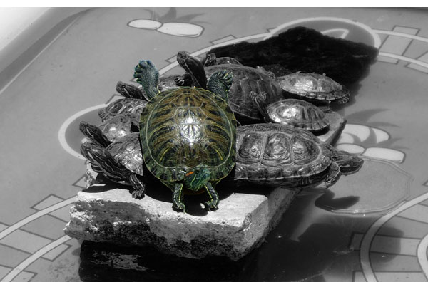 But otherwise they are easy to please. Change their water once a week to ten days. Throw in the occasional calcium brick. Give them an occasional meat treat. And share looks over a cigarette. In the morning, they’ll climb, one by one onto the rock to sunbathe. Bob first, usually. They’ll jostle for the best sunbathing position. They love the sun, being reptiles and all. In the evening, once they’re certain the sun has gone for good and isn’t just hiding behind a cloud, they’ll slide back into the water. They’ll flirt a little with each other. And they’ll swim up to me when I appear at about 6pm. They know when food time is. The sight of a green bag packet being shaken tells them for sure, and they’ll start splashing around in excitement. They’ve picked up a nugget or two of info, for sure.