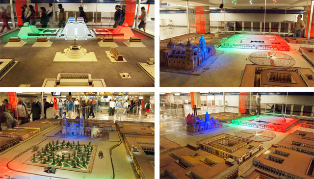 If your get to your first visit to the Zocalo, the very heart of Mexico City, by metro, you’ll get a little preparation of what to expect. You’ll step off the train, walk up the stairs to the main station and walk past three large glass cubicles containing models of the Zocalo as it used to be. One for the time of the Aztecs (top left), when the area was an island in a lake, called Tenochtitlan. Another from the colonial era (top and bottom right), and a third from, I am guessing the 1930’s or 40’s.