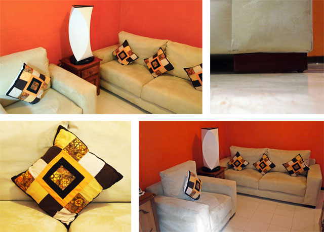 The cloth is a very soft material, and the suite is effectively in mint condition. The couple of scuffs around the base are of the most minor type possible. No stains, no tears, no sagging. The cost of the sofa from new was about 15,000 pesos. A couple of coins less, if I remember rightly. The lamp is a paper type lantern, but with a metal square on the base that you touch to brighten, dim, turn on and turn off the light. It has three brightness settings, and retailed for 800 pesos. The cushions were handmade for us last Christmas at a cost of 200 pesos each.