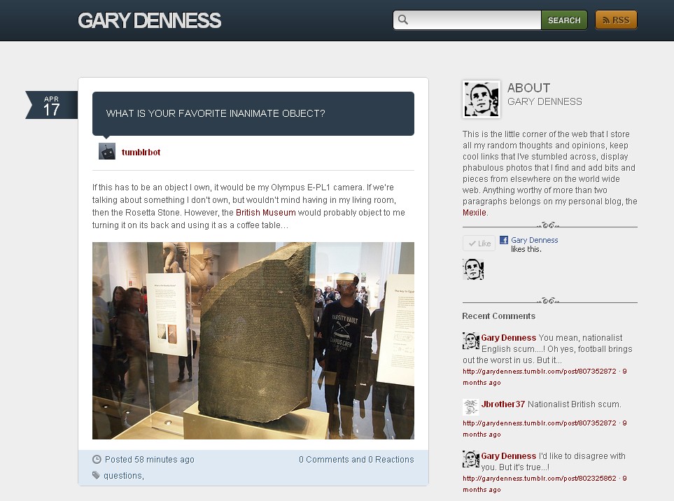 I’ve usually done this through Facebook, but then it disappears never to be found again. Sometimes I want to find things again. And seeing as all my Tumblr content gets pumped through Facebook anyway, it seems an effective way to share and organise stuff. So I hope to see you on my Tumblr blog – click here to go have a looky see. It has a couple of funky features by the by – Submit content for my consideration (!) or Ask A Question. Feel free to make use of both.