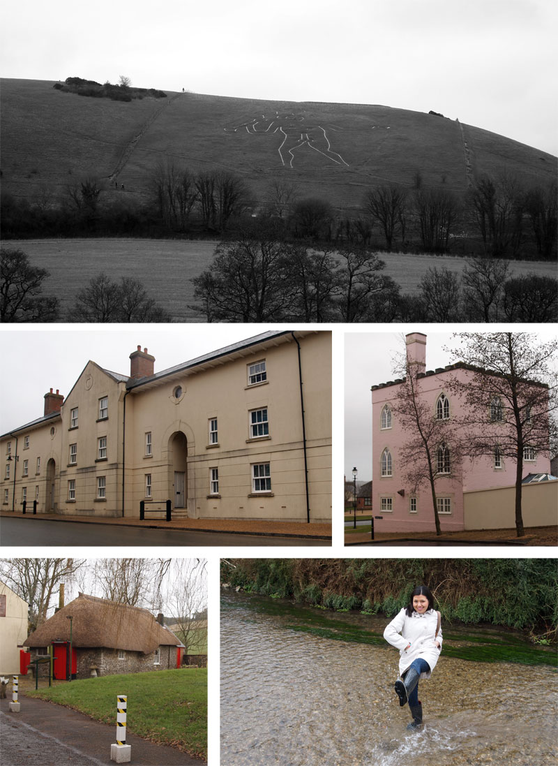 What to do on a grey, rainy Sunday afternoon? Go see an absolutely enormous penis to get things underway. Then a drink in the country’s smallest pub*. Drive through a bizarre town that features a dozen traditional architectural styles but where no building is more than 15 years of age – fans of enlightened monarchy might take to Prince Charles. Finally, if you’re not wet enough from the constant downpours, jump in a river. Who says there’s nowt to do in the rain in Dorset? Now to sit back and see what sort of attention my selection of title and tagging gets my blog…
