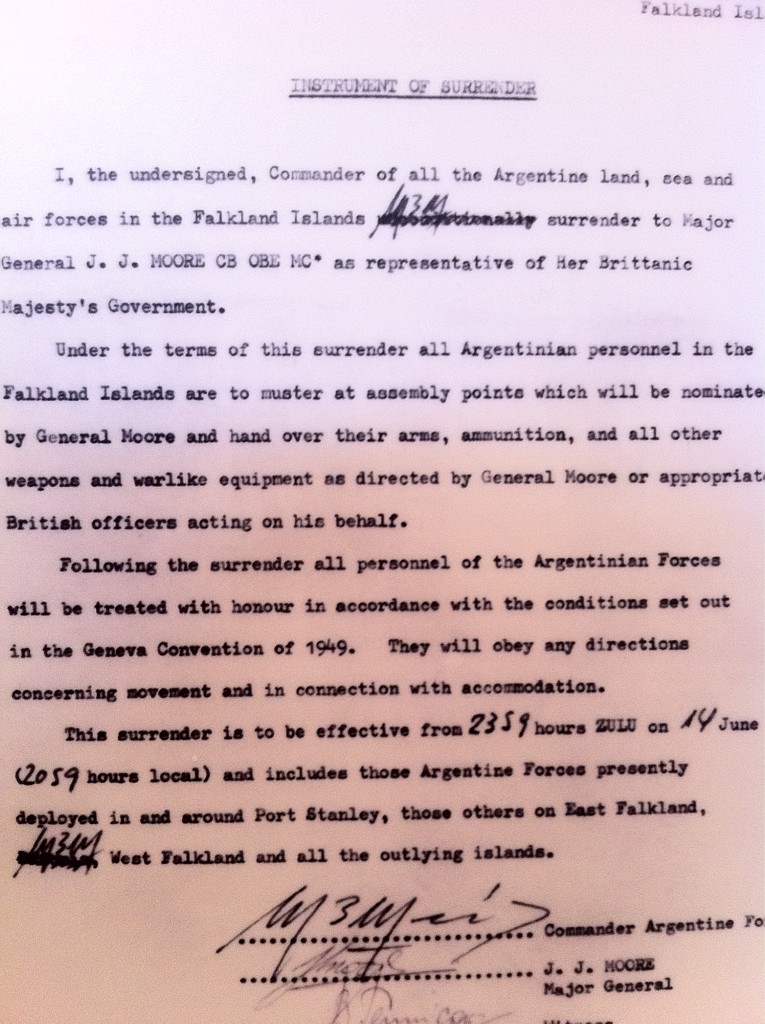 Ever wondered what a surrender looks like? The image below is the document signed by the man in charge of Argentine forces in the Falkland Islands, thirty years ago today. It’s a fairly bland and insignificant looking piece of paper. I’m sure it was painful to sign. A flourish of ink signalling the end of a dream. It also meant that the hundreds of Argentines killed in the conflict died in vain. Not that he had any choice other than to sign it. His poorly trained, equipped and supported conscripts may have held numerical superiority, but they had been routed at every turn by a professional army.