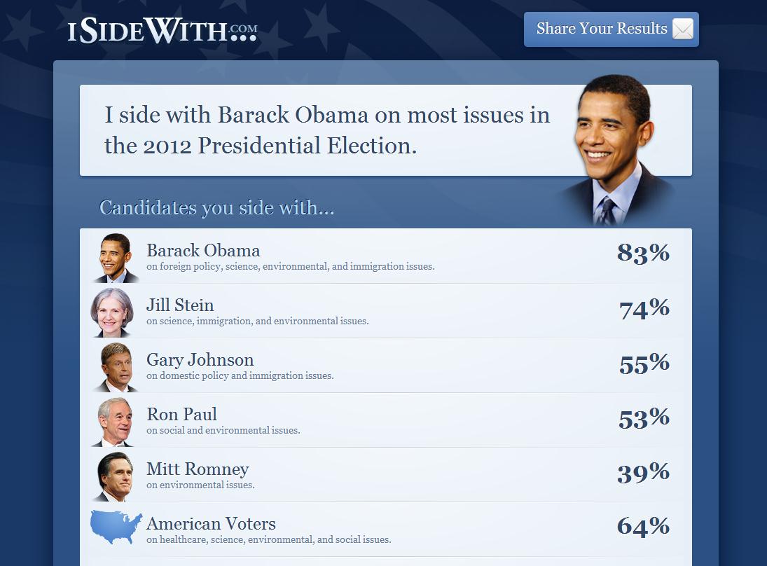 I did a quiz that is doing the rounds on Facebook. I’m pleased with the result. Not because I ‘side with Obama’. But because the figures attributed to my results aren’t extreme. Nothing in the 90%’s or 20%’s. It’s never good to end up on the extreme. It’ll usually mean, with a high degree of certainty, that you’re wrong. You’ve missed the point. And if Romney is high on up there, then you’ve probably lost touch with the real world.  No one likes government interfering in their lives. But…well, the ‘inventor’ of the blog puts it better than I can. But both the problems above will never be addressed by free markets. They are the sole responsibility of government. His site is well worth reading on a regular basis, for anyone interested in politics or tech.