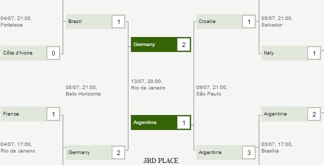 Finally there’s me. Again. Do you remember my pre-tournament prediction? I didn’t do so bad. I went for Germany beating Argentina in the final by one goal. I picked three of the four semi finalists. Although admittedly I did get a lot of the group results wrong. I was disappointed by the Ivory Coast. I really hoped they’d finally do something that reflects the talent in their squad. Russia and Croatia both disappointed to, although in my defence the Croatians lost one of their key players to injury just before the competition started. Still. I’m just left to wonder what the odds were on Germany beating Argentina before the whole thing kicked off….