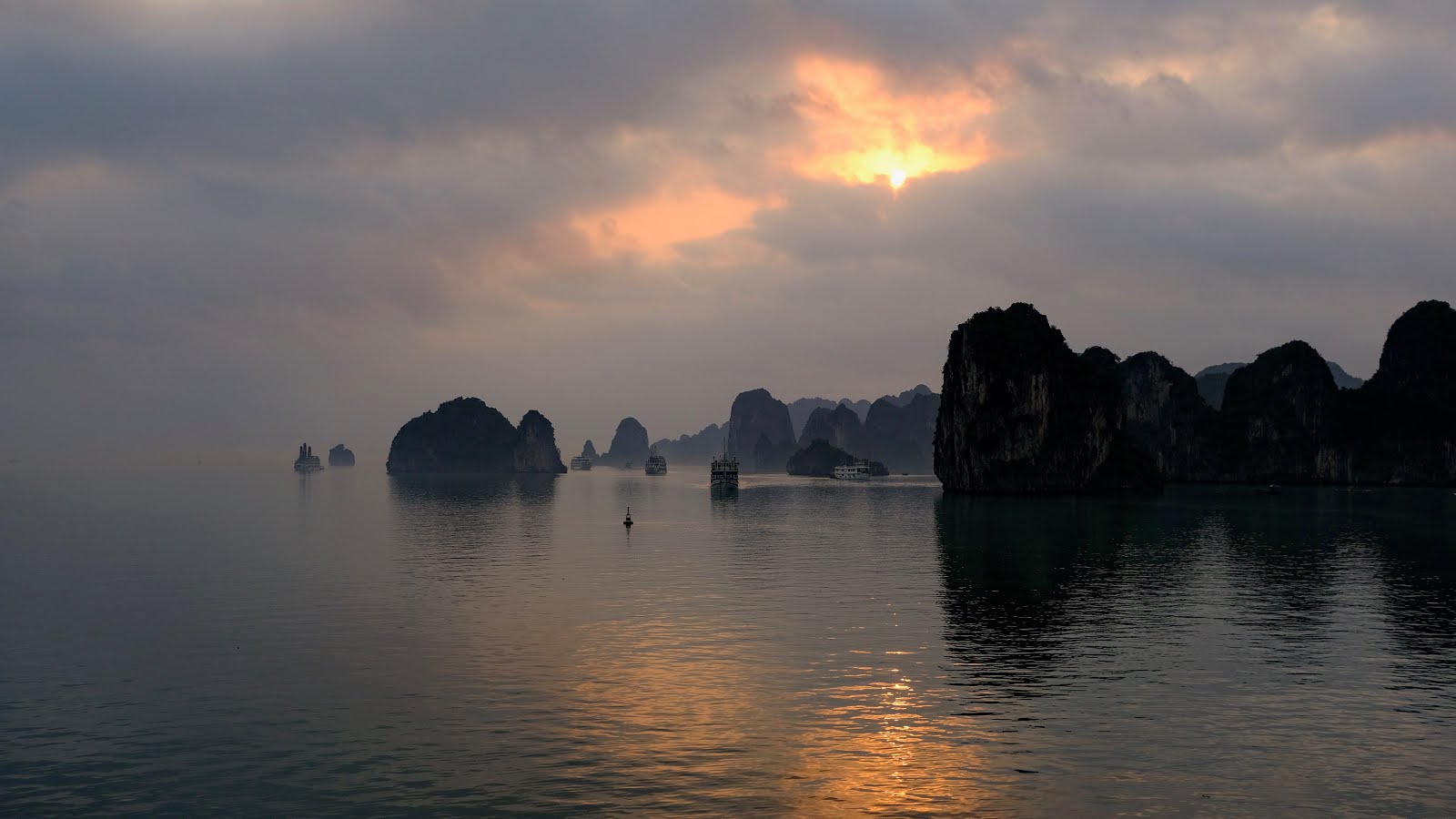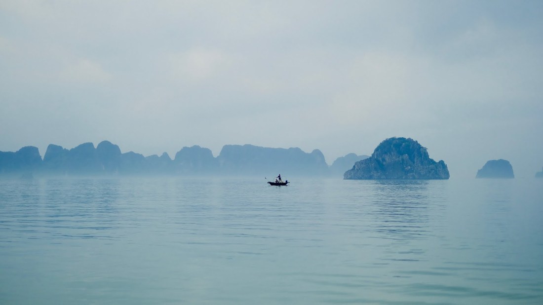 We were afloat for two and a half days in the bay. But the sun broke through the clouds for just a few minutes on the final morning, just after dawn. And then disappeared, not to be seen again. Not by us, anyway. The sun stayed just long enough for me to capture the photo above. It would have been nice to have had some more sun. But the sea mists, at dawn and dusk especially, added their own magic to the spectacular karsts, rising out of the Gulf of Tonkin.